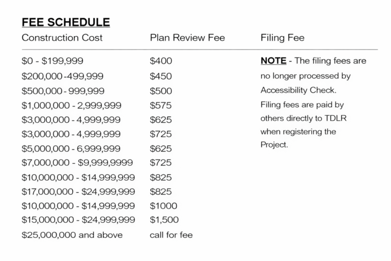 The following outlines what is required and our corresponding fees when submitting plans to ACCESSIBILITY CHECK for a TAS accessibility PLAN REVIEW.